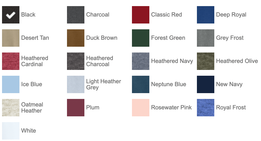 - 60/40 ring spun cotton/polyester (Heathers and Royal Frost)